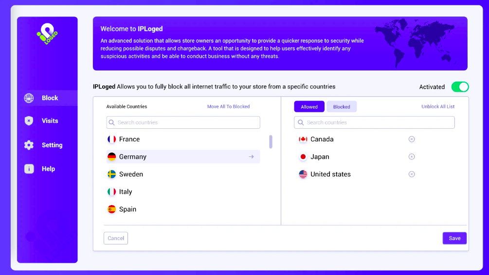 Block Spy (BS)– One key factor in protecting your store is the ability to immediately block a spy. IPLoged allows you to fully shut off all internet traffic from a specific country in visiting your store.